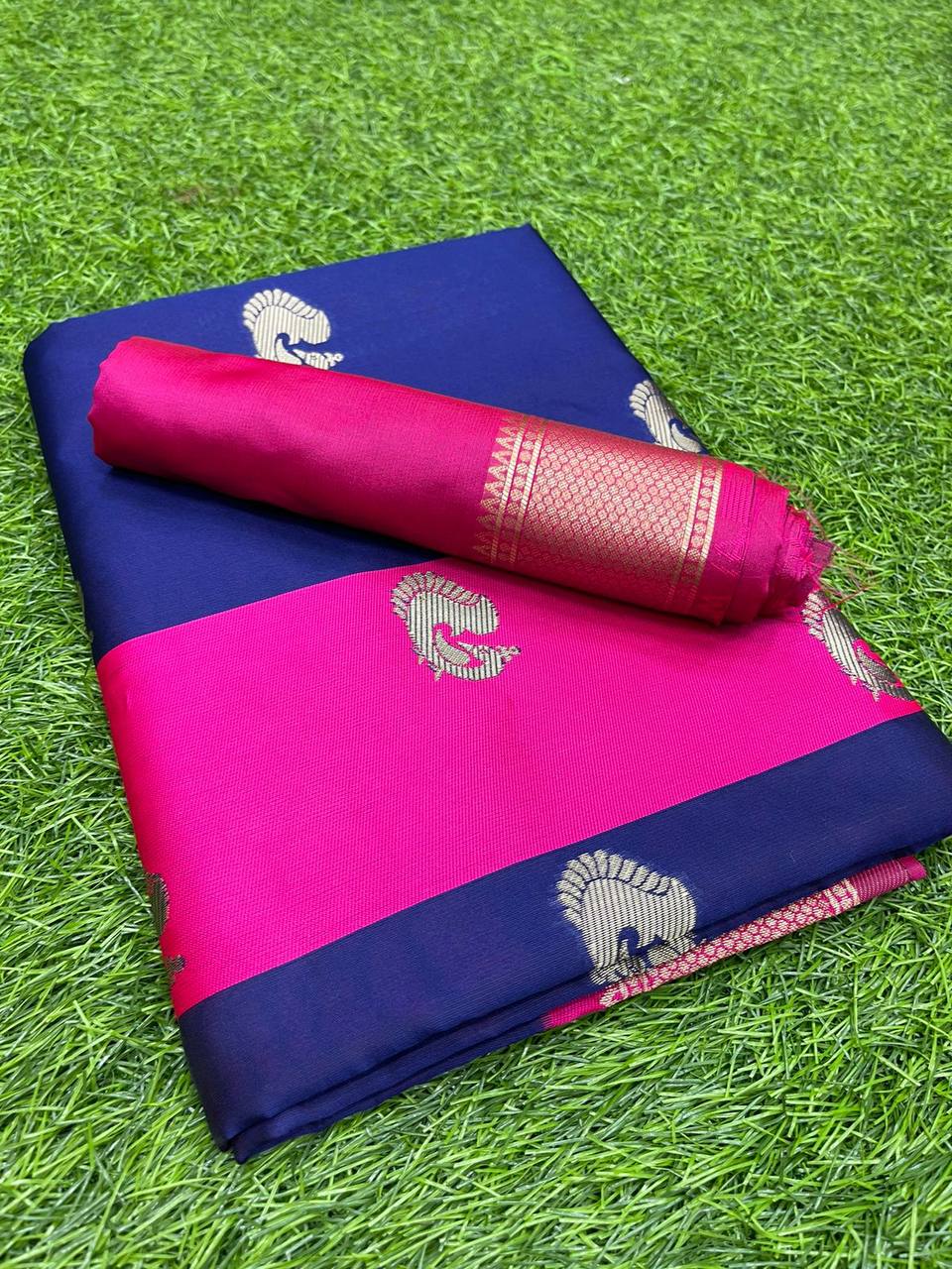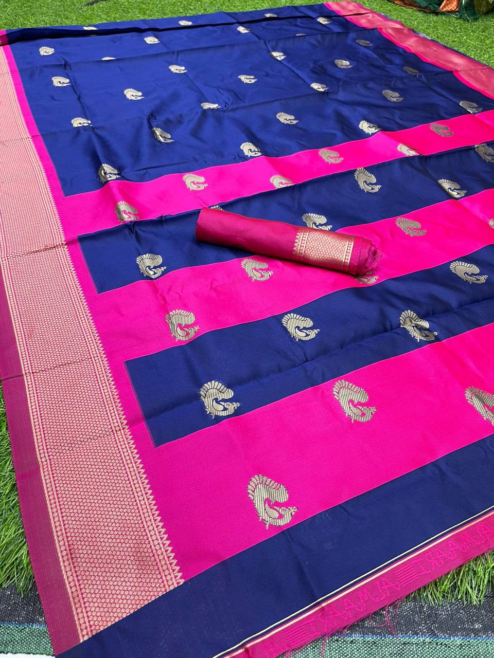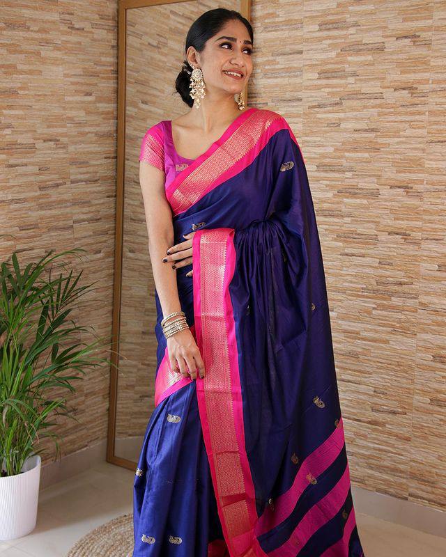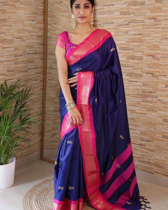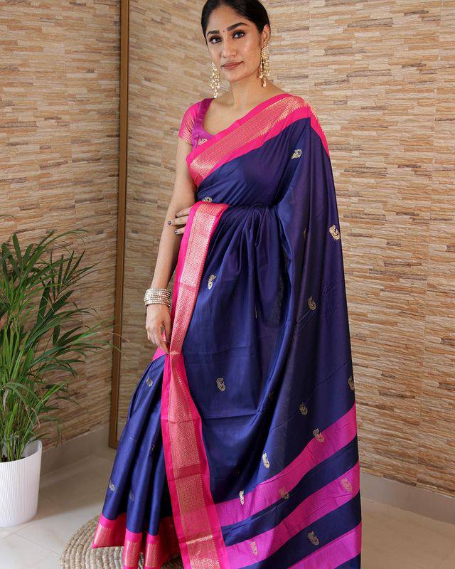 Navy Blue With Pink Broder & Blouse Weaved With Golden Zari